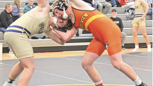 Carson works for the advantage: Ridge View’s Carson Jacobson locks up with his opponent from Sioux City Heelan. Carson won this 175-pound match by fall, and the Raptors defeated the Crusaders 69-12. Photo by Brent Harm
