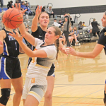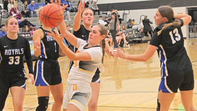 Alyssa draws some attention: Ridge View’s Alyssa Biede has the attention of four MMCRU defenders as she secures possession of the basketball. Photo by Brent Harm